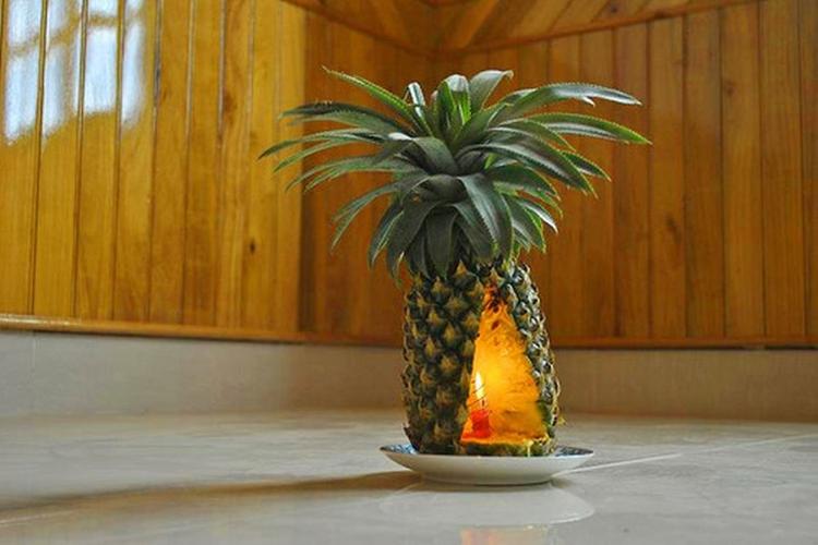 Quả dứa không chỉ mang lại hương thơm tươi mát mà còn có tác dụng khử mùi hiệu quả. Bạn có thể khoét rỗng ruột quả dứa, đặt một cây nến vào bên trong để tạo thành một chiếc đèn xông tinh dầu độc đáo, vừa khử mùi vừa làm vật trang trí.