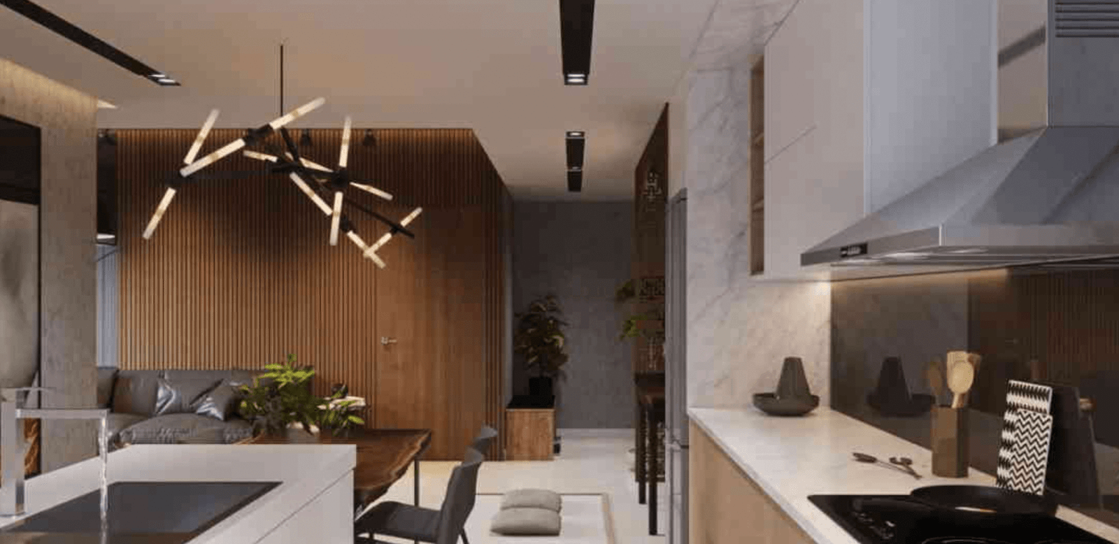 Phòng khách hiện đại với sofa da, bàn ăn, đèn chùm độc đáo và bếp mở, tạo không gian ấm cúng và sang trọng. Phòng ngủ hiện đại với họa tiết gấu hình học trên tường, nội thất tông màu xám và gỗ. Nhà bếp hiện đại với tủ gỗ, đèn treo sang trọng và bếp nấu ăn, mang đến không gian nội thất ấm cúng.