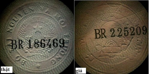 So sánh hình Quốc huy trên sổ đỏ thật và sổ giả khi soi đèn pin.Ngược lại, trên sổ đỏ giả, hình Quốc huy thường bị in lõm, không rõ ràng, và mã số hiệu có thể bị in lệch do sử dụng phương pháp in màu kỹ thuật số.