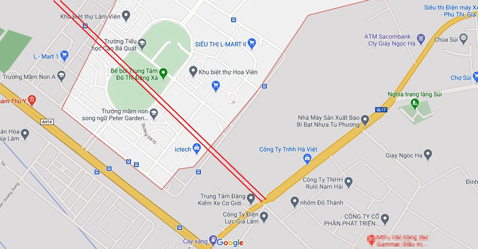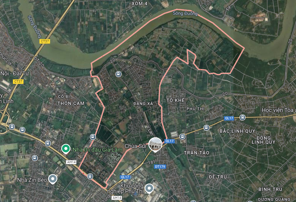 Ranh giới địa lý xã Đặng Xá, huyện Gia Lâm, Hà Nội (Ảnh: Google Earth)