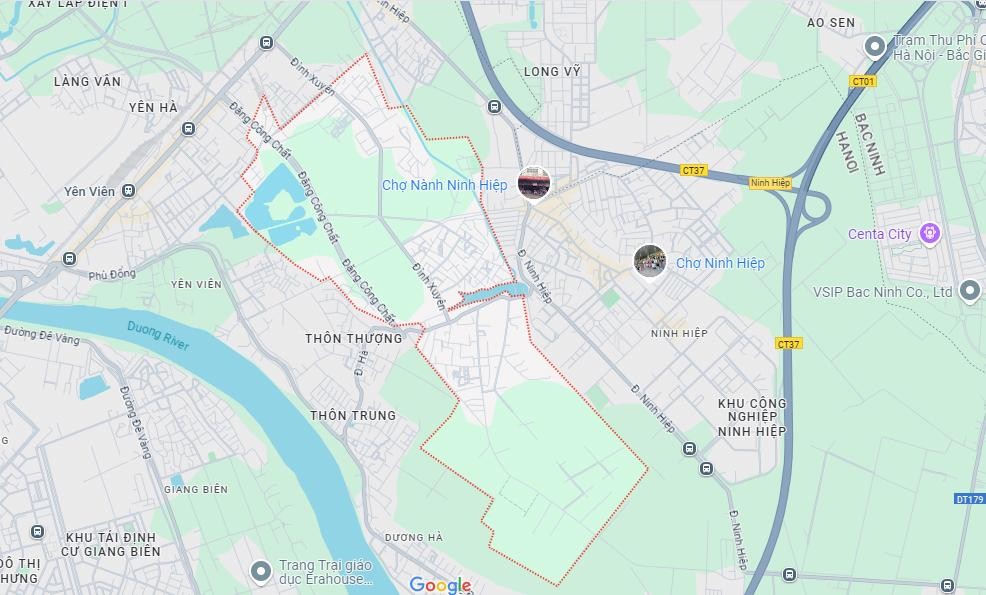 Xã Đình Xuyên tọa lạc tại trung tâm Cụm Bắc Đuống, trung tâm của huyện Gia Lâm (Nguồn: Google Map)