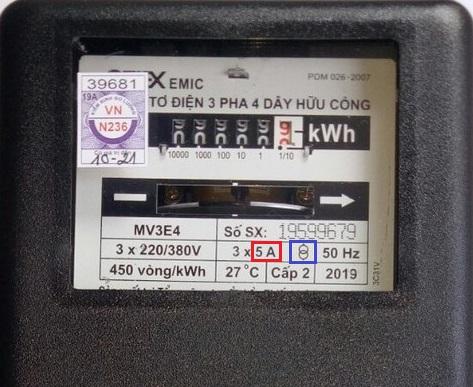 Loại đồng hồ này có cách đấu dây phức tạp hơn, sử dụng biến dòng và thường áp dụng cho các tải có công suất lớn. Thông số dòng điện định mức phổ biến là 5A (màu đỏ), kèm ký hiệu gián tiếp (màu xanh). Đồng hồ cũng có 6 chữ số, cách đọc tương tự đồng hồ 1 pha: 5 số đen (kWh) và 1 số đỏ (1/10 kWh). Ví dụ, chỉ số 310721 được đọc là 31072,1 kWh.