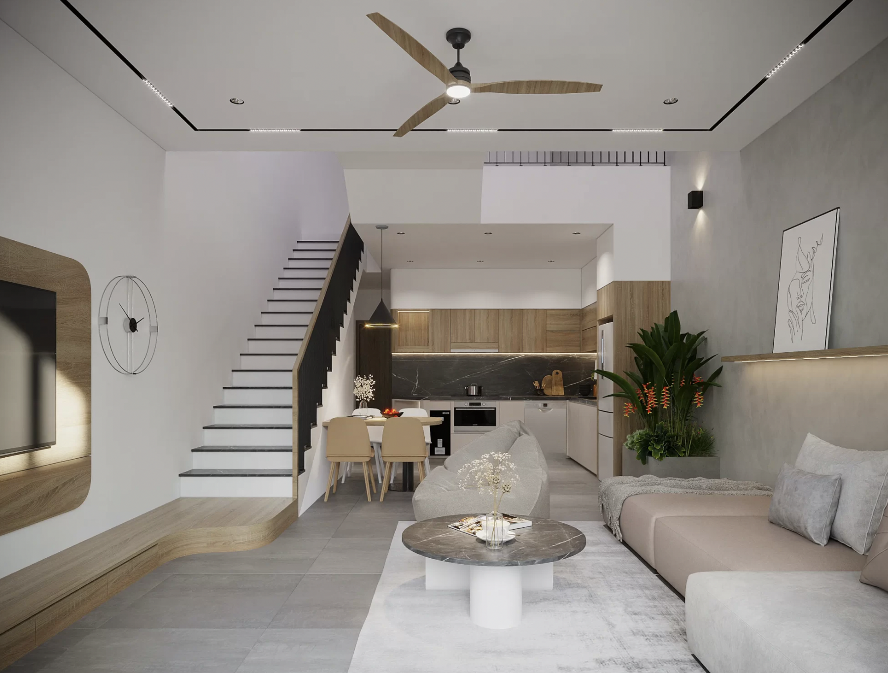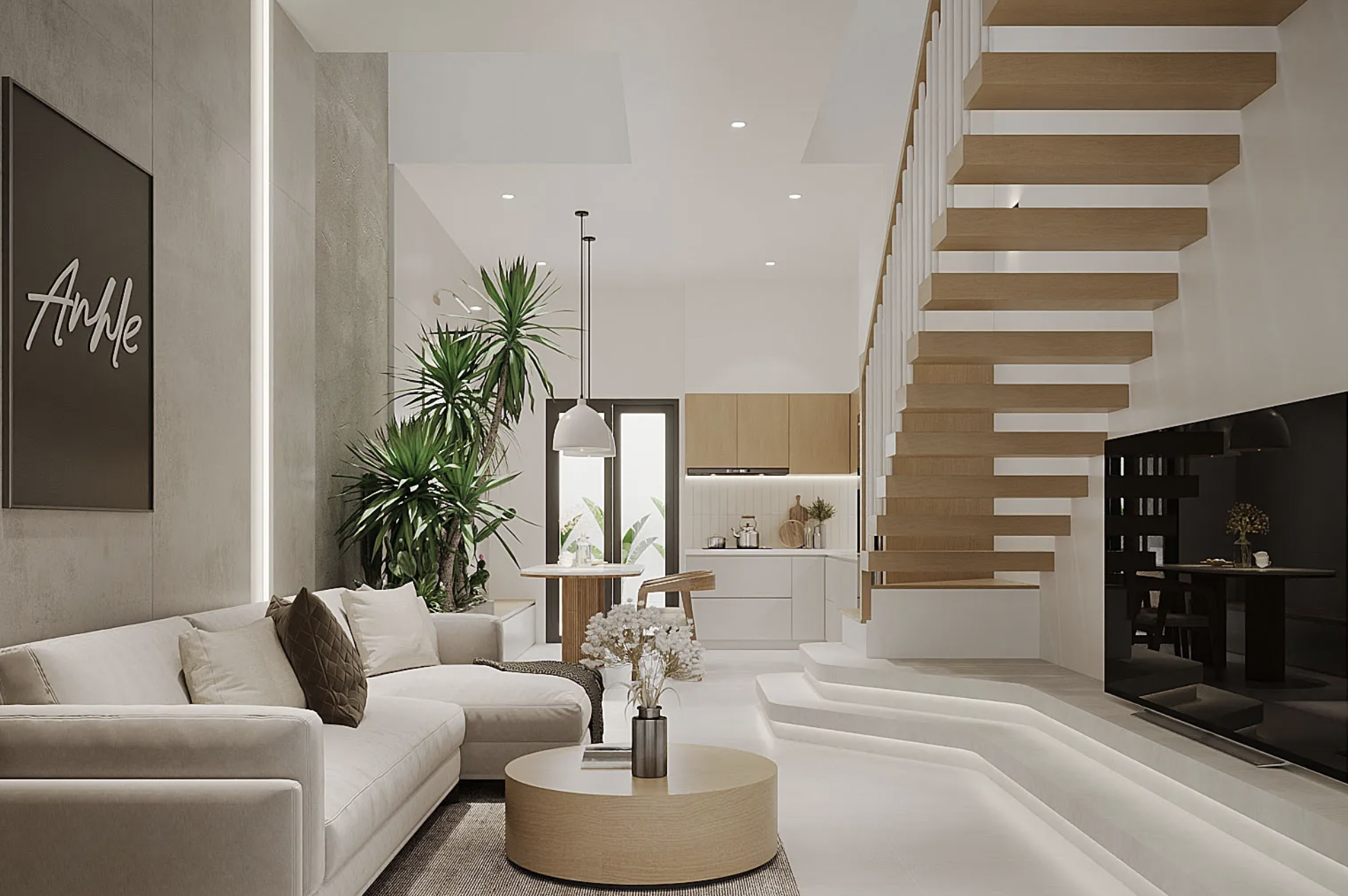 Mẫu nhà 2 tầng với cầu thang dọc từ gỗ công nghiệp, mang lại sự mộc mạc mà không kém phần sang trọng. Sự kết hợp về chất liệu và màu sắc hòa quyện hoàn hảo với phong cách nội thất của ngôi nhà.