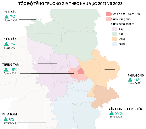 Giai đoạn 2017 – Quý 4/2022, giá chung cư sơ cấp toàn Hà Nội ghi nhận mức tăng trưởng trung bình 13,8% mỗi năm. Khu Đông mở rộng nổi bật với mức tăng giá cao nhất, đặc biệt là Văn Giang – Hưng Yên với mức tăng 29%/năm, tiếp theo là khu Đông Hà Nội (Long Biên, Gia Lâm) với 16%/năm. Các khu vực phía Tây và phía Bắc có mức tăng trưởng trung bình thấp hơn, khoảng 7%/năm.