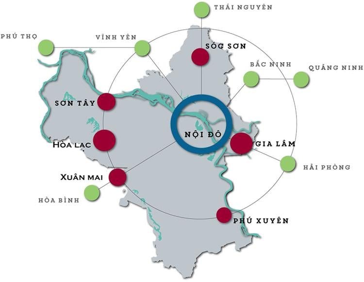 • Hà Nội: Có 5 đô thị vệ tinh tại Sóc Sơn, Hòa Lạc, Sơn Tây, Xuân Mai và Phú Xuyên.