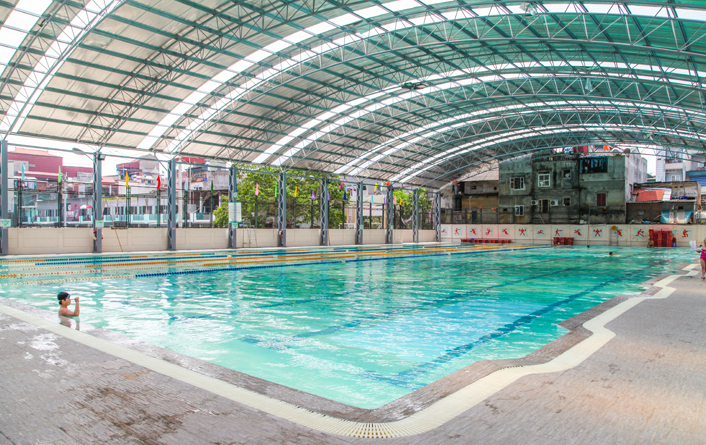 Điểm cộng lớn của bể bơi là hệ thống mái che, giúp duy trì nhiệt độ nước ổn định và bảo vệ người bơi khỏi tác động của thời tiết nắng nóng hay mưa gió. Không gian xung quanh bể còn được tô điểm bởi cây xanh, mang đến cảm giác thư thái và gần gũi với thiên nhiên.