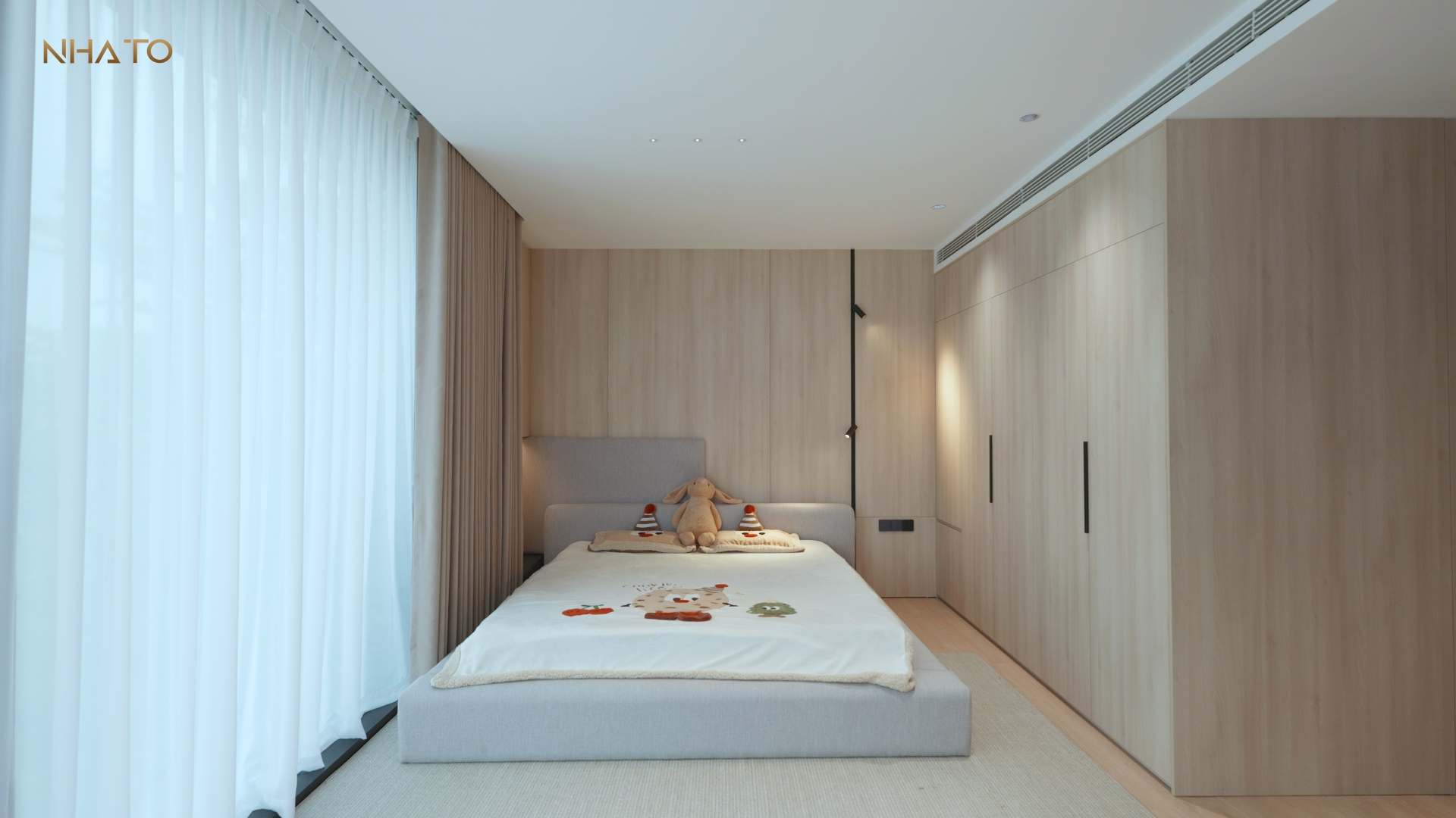 Sàn gỗ nâu sẫm hút ánh sáng – như một cách tạo tầng thị giác cho mỗi bước chân. Chi tiết nhỏ – nhưng là nơi đánh bật đẳng cấp thiết kế.