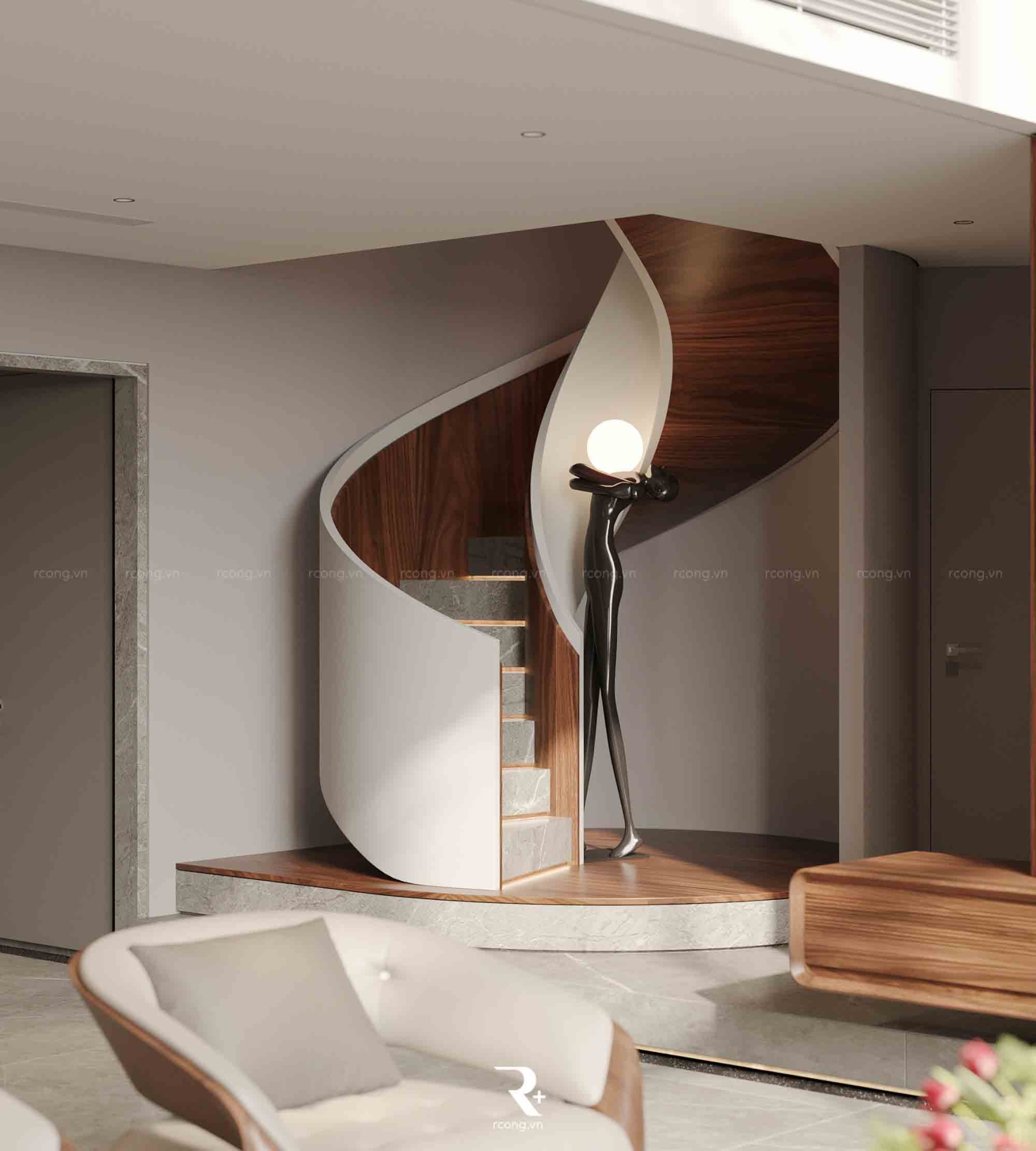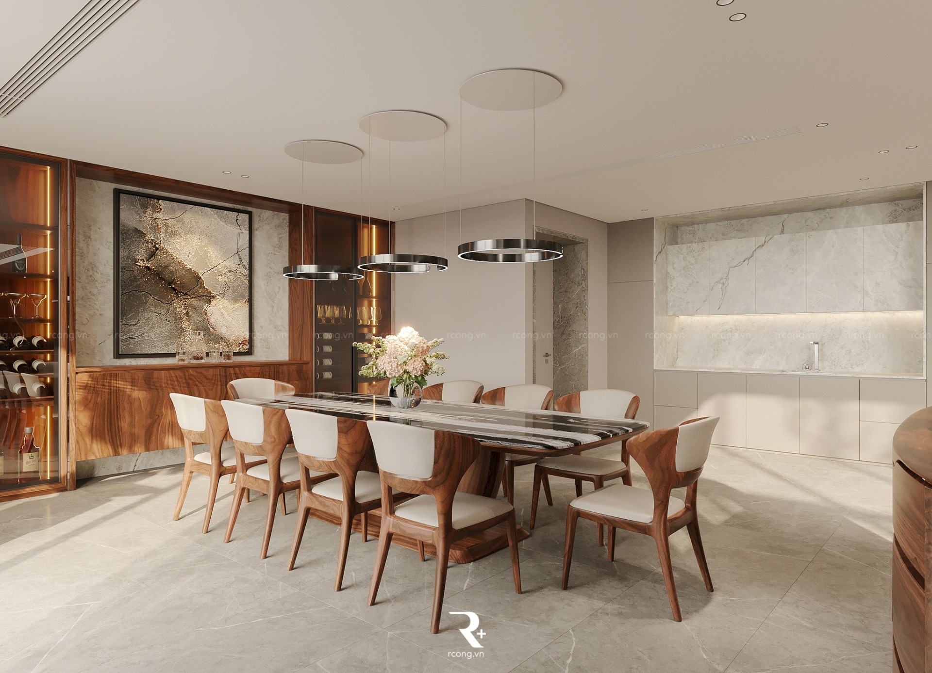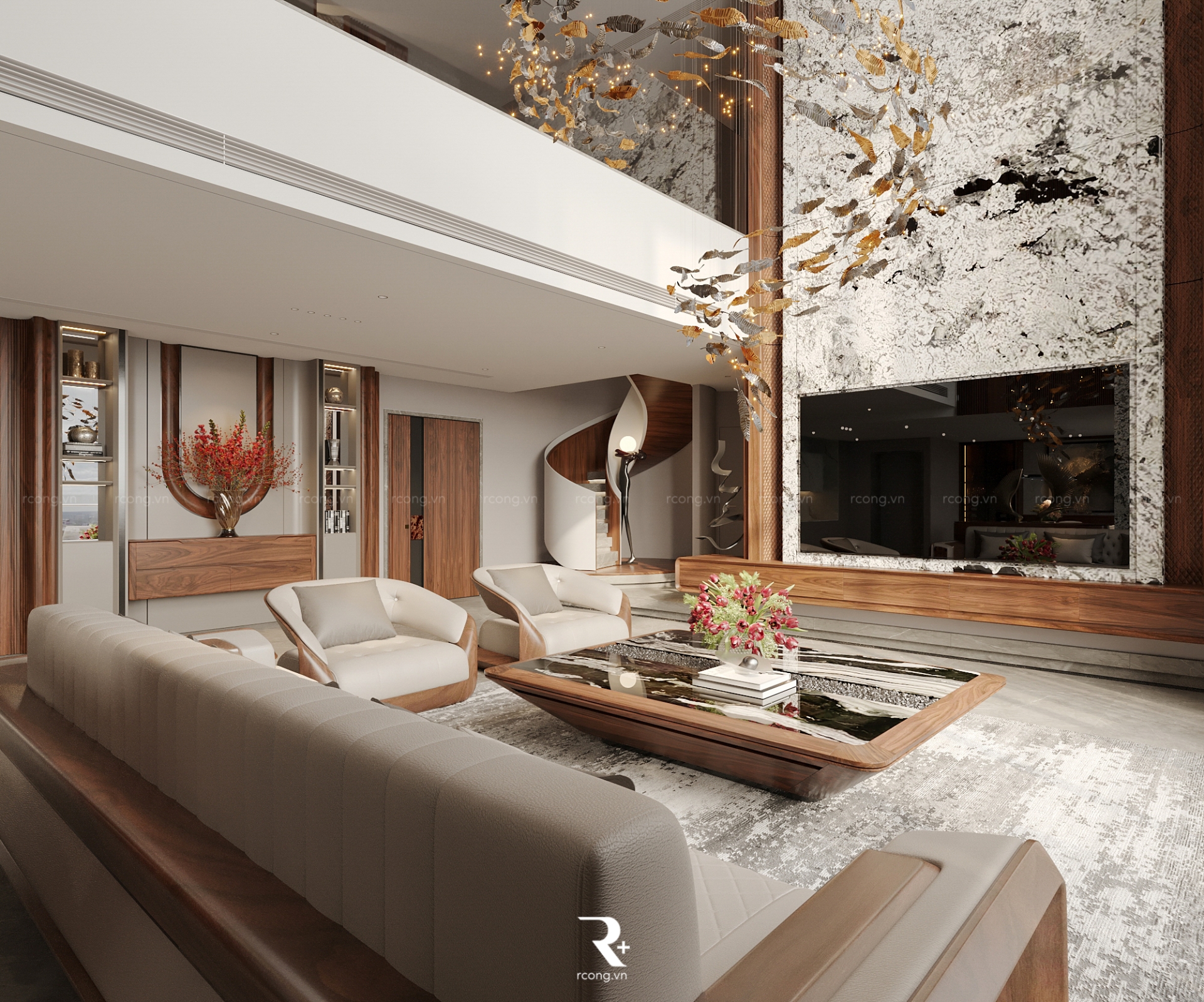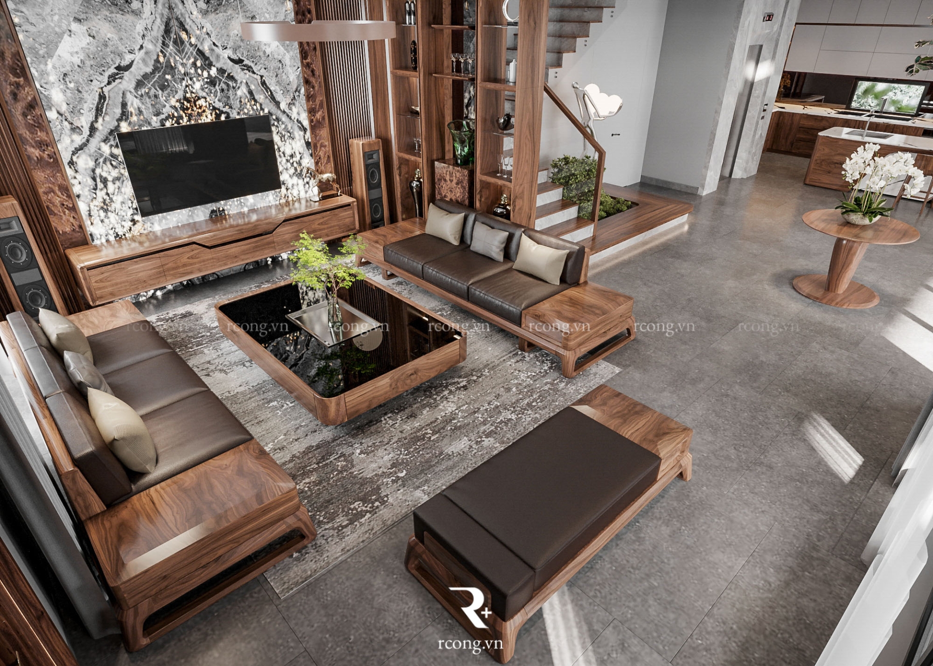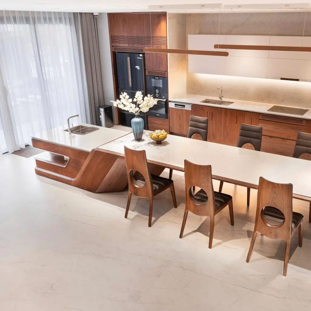 Nhờ sự kết hợp khéo léo với ánh sáng và không gian trống, nội thất gỗ óc chó ở đây không chỉ đơn thuần là vật liệu, mà là sự thể hiện tinh tế của nghệ thuật sống thượng lưu.