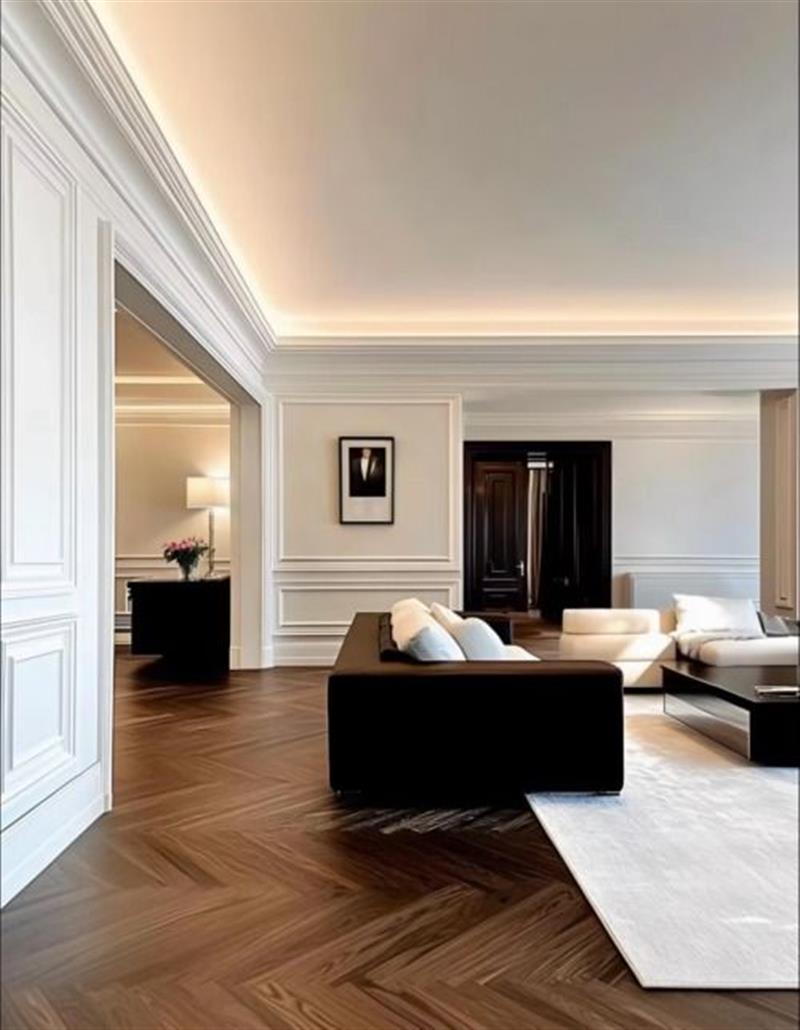 Sàn nhà bằng gỗ ghép xương cá luôn gợi nhớ đến những căn hộ sang trọng mang phong cách Haussmann tại Paris. Các vân gỗ tự nhiên khi được đặt ở góc 45 độ sẽ bắt sáng đa chiều, tạo ra cảm giác không gian được mở rộng và có chiều sâu hơn.