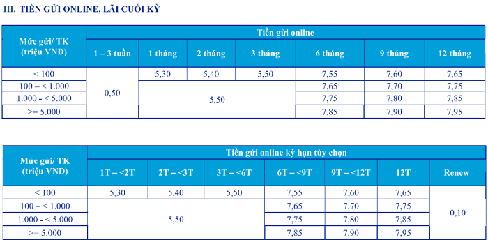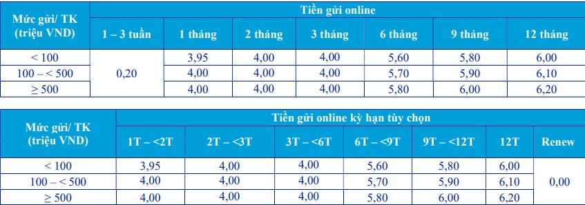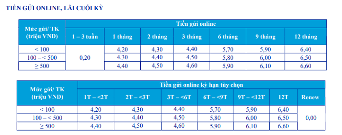 Đối với hình thức gửi tiền online, lãi suất áp dụng cho kỳ hạn từ 1 đến 12 tháng dao động từ 4,2%/năm đến 6,6%/năm, cao hơn từ 0,2% đến 0,4% so với lãi suất tại quầy. Tiền gửi online kỳ hạn 1-3 tuần cũng có lãi suất 0,2%/năm.