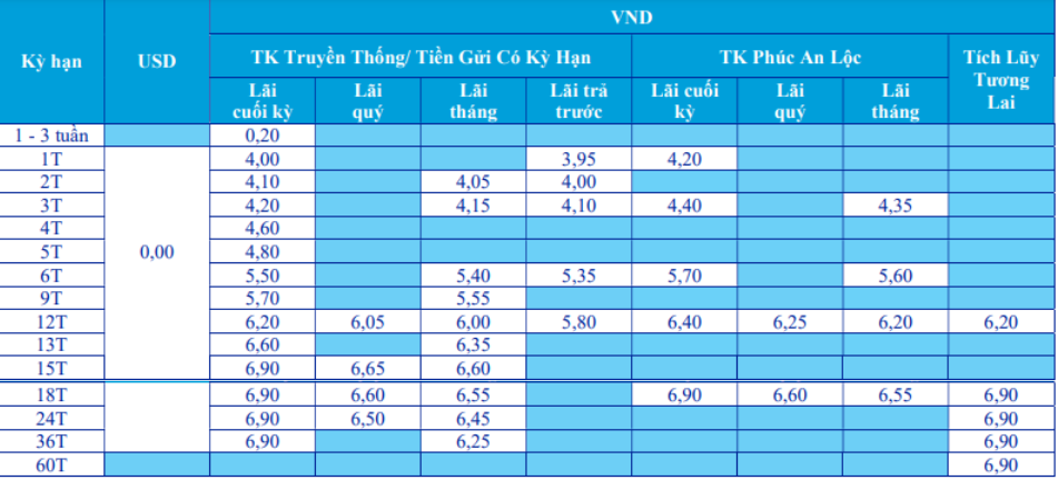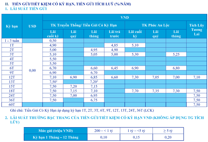 Biểu lãi suất tiền gửi cá nhân đã được điều chỉnh tăng và mở rộng thêm nhiều kỳ hạn so với tháng trước. Các sản phẩm nổi bật bao gồm Gói tài lộc, Gói “Chọn sống mới, trọn chất tôi” và Gói tiết kiệm online.
