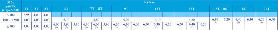 Kỳ hạn 12 tháng ghi nhận mức lãi suất 6,2%/năm, trong khi kỳ hạn 13 tháng có lãi suất 6,6%/năm.
