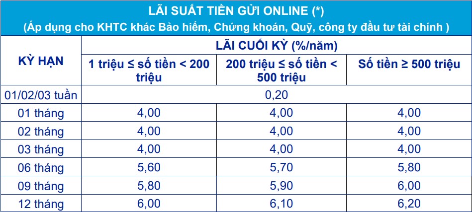 Đáng chú ý, lãi suất tiền gửi online đã được điều chỉnh tăng mạnh từ 0,4% đến 0,9% ở các kỳ hạn 6 đến 12 tháng. Mức lãi suất mới cho tiền gửi online dao động từ 3,95%/năm đến 6,2%/năm cho kỳ hạn 1 đến 12 tháng. Kỳ hạn siêu ngắn 1-3 tuần vẫn giữ nguyên mức lãi suất 0,2%/năm.