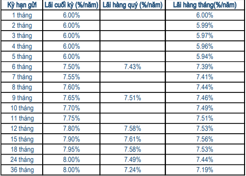 Đối với các kỳ hạn từ 6 đến 11 tháng, lãi suất tăng thêm khoảng 0,6% đến 0,85%/năm, nâng mức lãi suất lên 5,8%-6,3%/năm. Kỳ hạn 12 tháng và 13 tháng có mức lãi suất lần lượt là 6,5%/năm và 6,6%/năm. Mức lãi suất ưu đãi nhất dành cho khách hàng cá nhân là 6,9%/năm, áp dụng cho kỳ hạn 24 và 36 tháng.