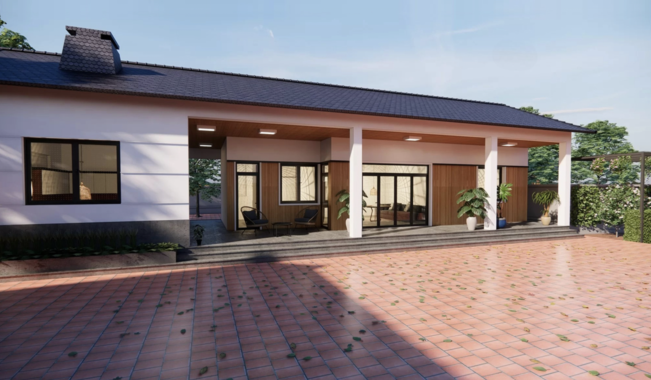 Nhà 5 gian với sân vườn là sự chọn lựa lý tưởng cho các gia đình yêu thiên nhiên. Phần sân rộng rãi có thể sử dụng để đỗ xe hoặc trồng cây. Kiến trúc thường có mái ngói hoặc mái thái, kết hợp với sân gạch hoặc vườn cỏ, tạo ra không gian bình yên. Mẫu nhà này đặc biệt phù hợp với các khu vực nông thôn có diện tích đất rộng.