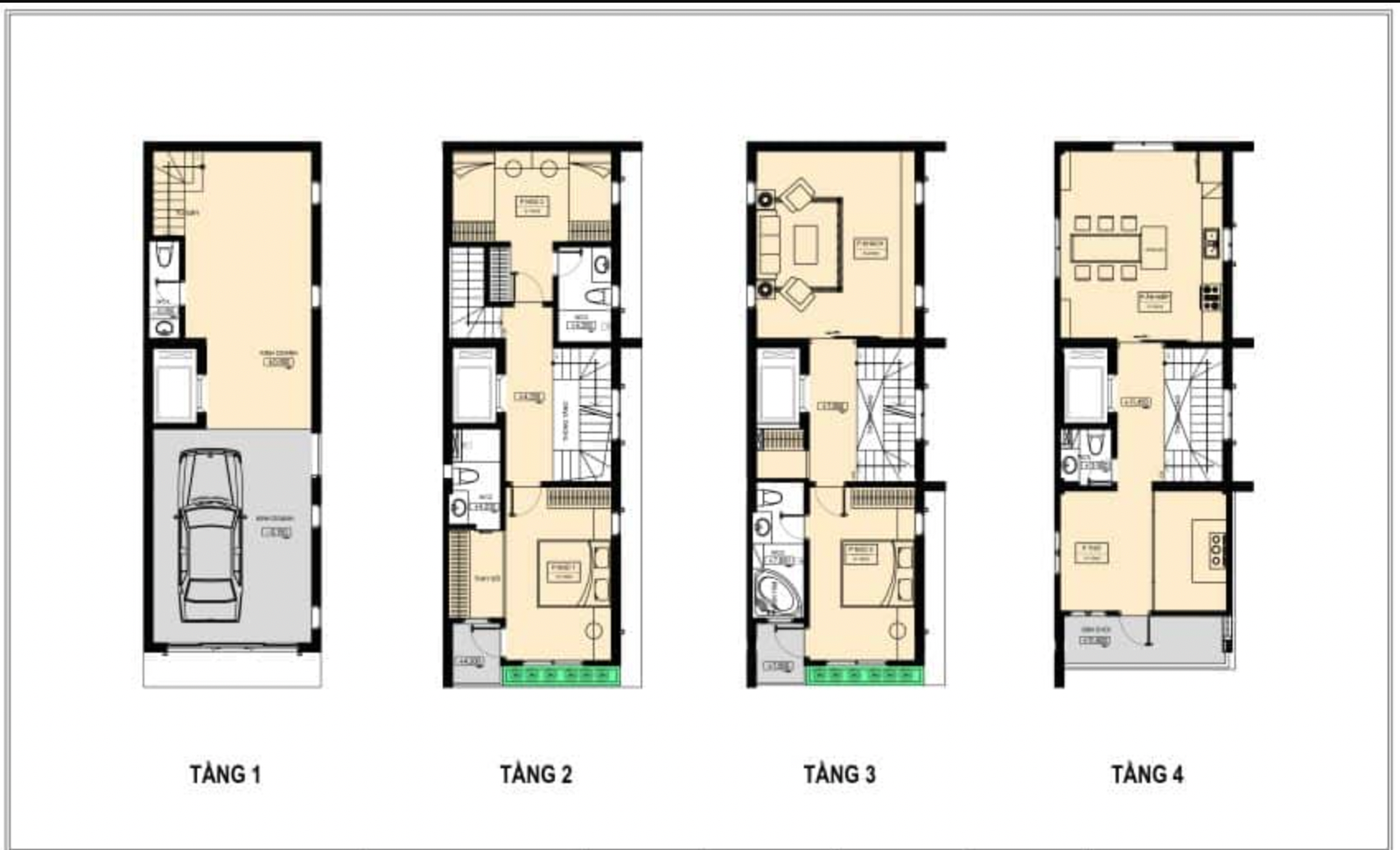 Mẫu Thiết Kế Nhà Phố 4 Tầng Có Gara Ô Tô là một không gian sống hoàn hảo, dung hòa giữa không gian ở và gara ô tô, tạo ra môi trường sống đa năng và tiện nghi cho gia đình. Mẫu thiết kế này minh chứng cho việc sử dụng diện tích thông minh có thể đem lại sự thoải mái, hiện đại cho nhà phố. Tầng trệt thoáng đãng, tối ưu không gian cho gara ô tô, bảo vệ phương tiện và nâng cao thẩm mỹ ngôi nhà. Khu vực phía sau có thể làm sân vườn, bể cá phong thủy hoặc giếng trời, giúp lưu thông không khí và ánh sáng cho ngôi nhà.