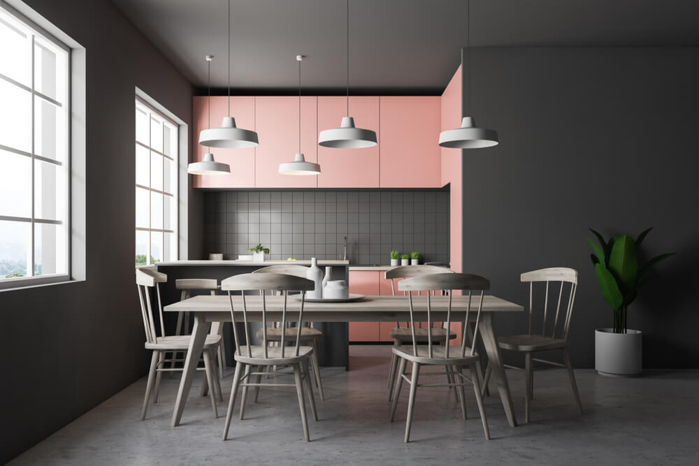- Phòng ăn và bếp: Áp dụng màu hồng tro cho thảm, rèm cửa hoặc một phần thiết kế tủ bếp. Màu sắc này giúp tạo không khí ấm cúng, thân mật, lý tưởng cho các buổi sum họp gia đình và bạn bè.