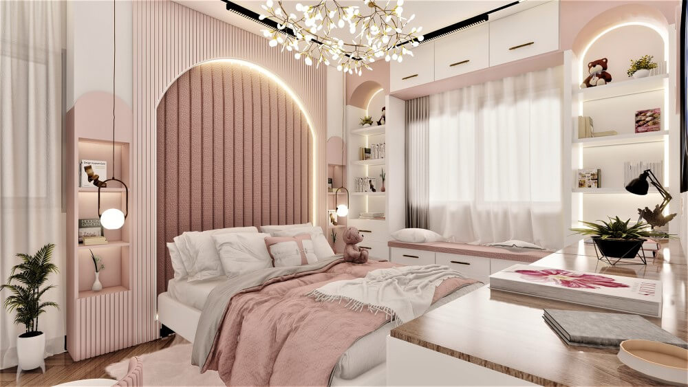 - Phòng ngủ: Tạo không gian nghỉ ngơi yên bình với hồng tro làm màu chủ đạo cho tường, chăn ga, rèm cửa. Kết hợp ánh sáng dịu nhẹ để tăng cảm giác ấm cúng và riêng tư.