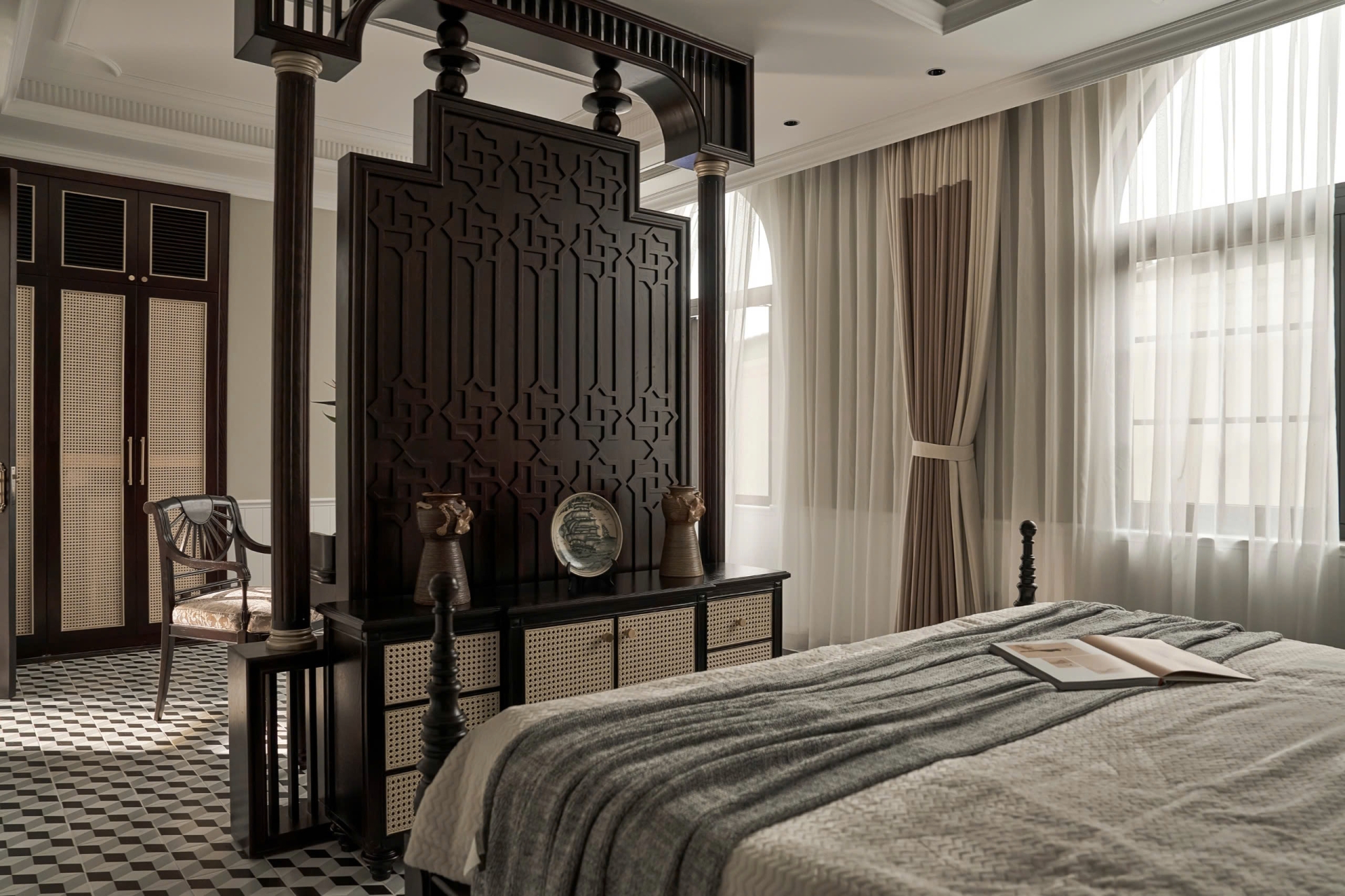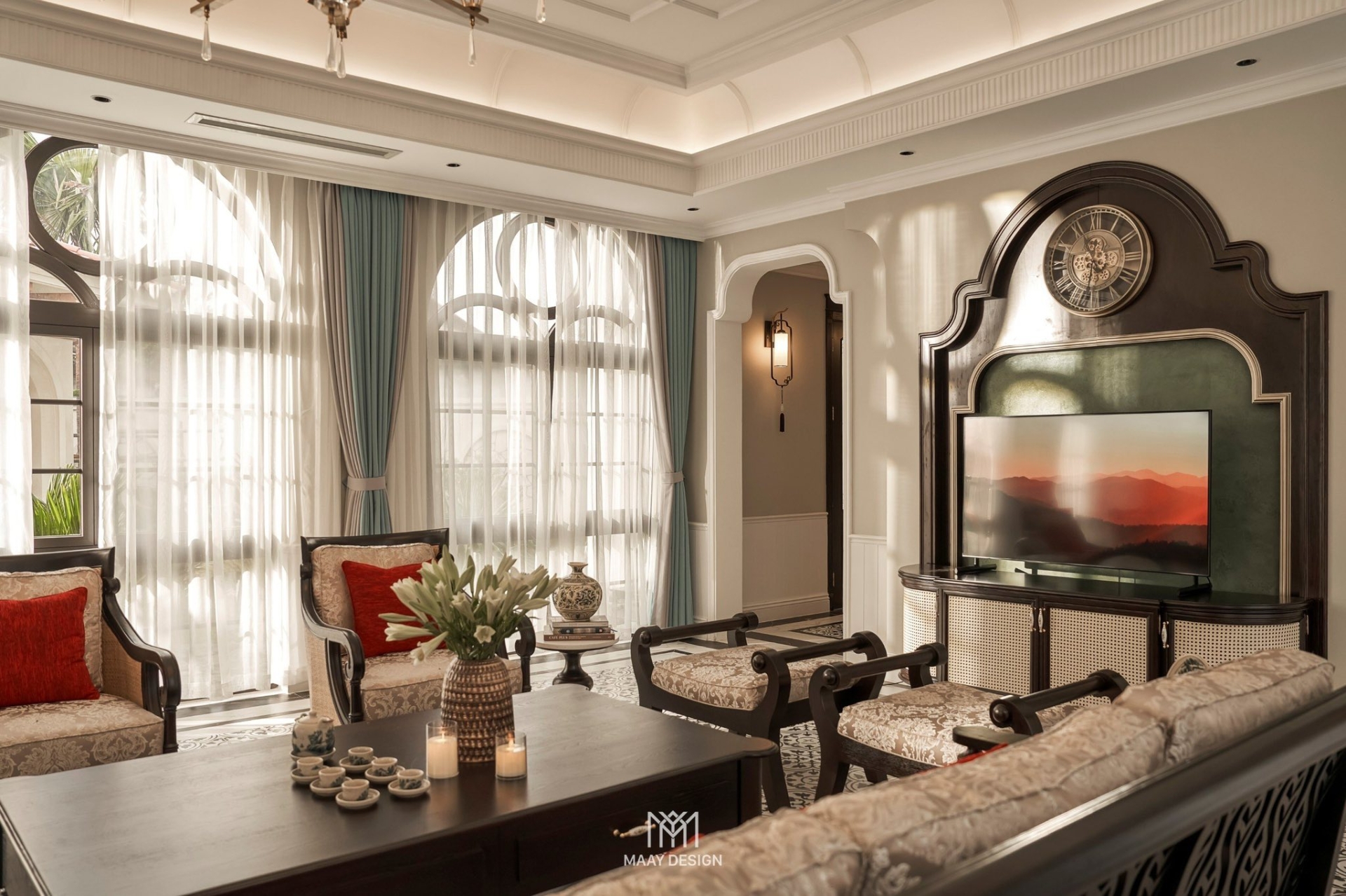 Không gian nội thất là sự kết hợp tài hoa giữa thẩm mỹ Đông Dương và tiện nghi đương đại: Trần cao, không khí đối lưu tốt – làm dịu mùa hè và khô thoáng mùa mưa. Tường vôi trắng đan cài màu xanh lục, nâu gỗ – bảng màu gợi nhớ ký ức miền nhiệt đới. Gạch hoa truyền thống phối với nội thất hiện đại – một cuộc đối thoại giữa xưa và nay.