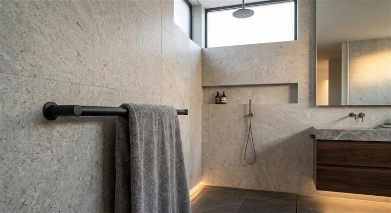 Sự tinh vi của phòng tắm không rào cản còn nằm ở cách bố trí công năng. Những chiếc thanh vịn (grab bars) thô kệch giờ đây được tái thiết kế, tích hợp khéo léo dưới hình dáng của một chiếc vắt khăn tắm mạ PVD sang trọng, hay các kệ để đồ âm tường bằng hợp kim nguyên khối có khả năng chịu tải trọng vượt trội.