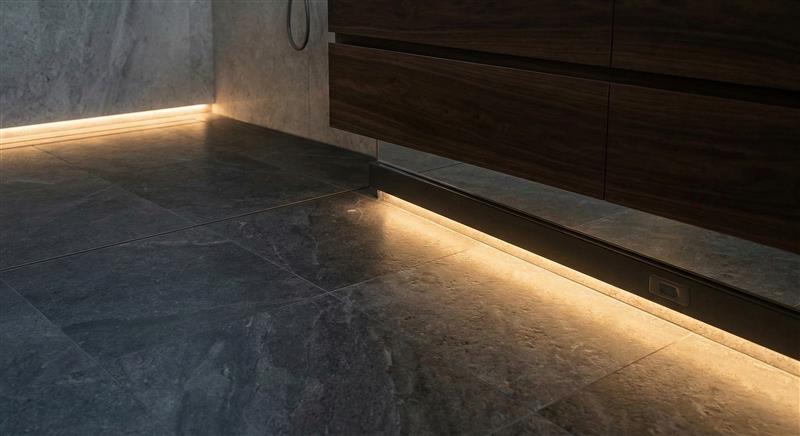 Bên cạnh đó, công nghệ đóng vai trò như một người trợ lý thầm lặng. Hệ thống van điều nhiệt thông minh tự động khóa mức nước nóng, triệt tiêu hoàn toàn nguy cơ bỏng nhiệt cho trẻ em và người già. Cùng với đó là kịch bản chiếu sáng cảm biến chuyển động với ánh sáng vàng dịu nhẹ dưới chân vách tường, tự động kích hoạt khi có bước chân vào ban đêm, dẫn hướng an toàn mà không làm gián đoạn giấc ngủ.
