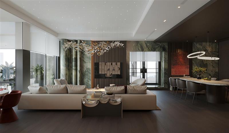 Nhưng sự xa xỉ không chỉ nằm ở việc quý hiếm. Những phiến đá thô cứng đã được xử lý uốn cong để chúng trở nên mềm mại như vải, cho phép ánh sáng đi xuyên qua như hơi thở. Đó là sự mâu thuẫn đầy nghệ thuật giữa vật liệu và cảm xúc: biến cái cứng nhắc thành sự dịu dàng, biến đá lạnh thành điểm nhấn ấm áp cho trái tim của ngôi nhà.