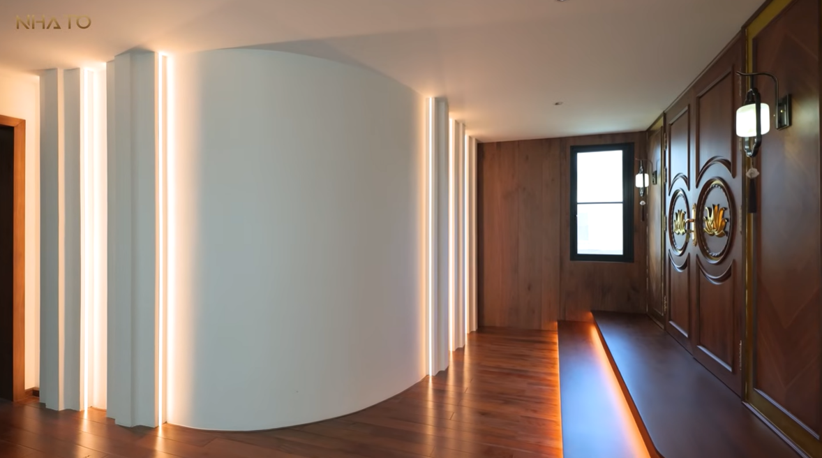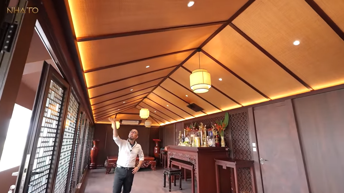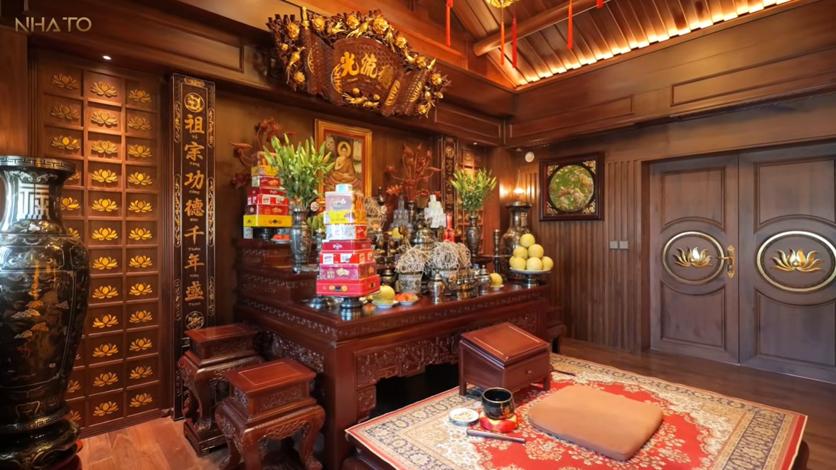 Bên trong, phòng thờ được hoàn thiện hoàn toàn bằng gỗ, khác biệt hoàn toàn so với không gian xung quanh, nhưng lại không làm không gian trở nên đơn điệu hay lạnh lẽo. Sự kết hợp giữa truyền thống và hiện đại trong không gian này thể hiện gu thẩm mỹ tinh tế của gia chủ – yêu thích sự thanh thoát, nhưng không thiếu phần trang nghiêm. Ánh sáng mờ ảo, không gian yên tĩnh là những yếu tố giúp tạo ra một không gian thờ cúng đầy cảm hứng, dễ chịu, mà vẫn giữ vững sự tôn kính.