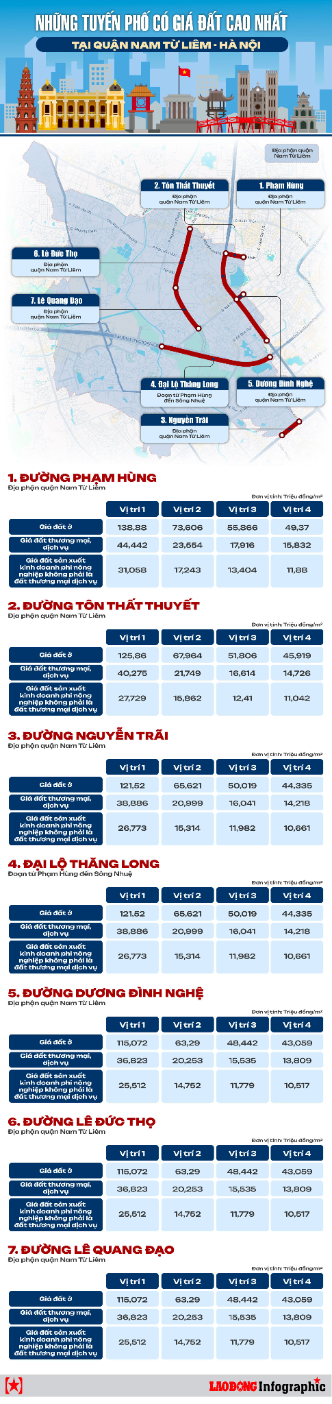 Trong năm 2025, thị trường bất động sản quận Nam Từ Liêm ghi nhận sự tăng trưởng ổn định về giá đất. Giá đất tại các tuyến đường có giá trị cao nhất, theo bảng giá đất mới nhất của UBND TP Hà Nội (áp dụng đến hết ngày 31/12/2025), có thể lên tới 138,88 triệu đồng/m² tại đường Phạm Hùng, tiếp theo là các tuyến đường Tôn Thất Thuyết, Nguyễn Trãi, Đại lộ Thăng Long, Lê Đức Thọ, Lê Quang Đạo, v.v.