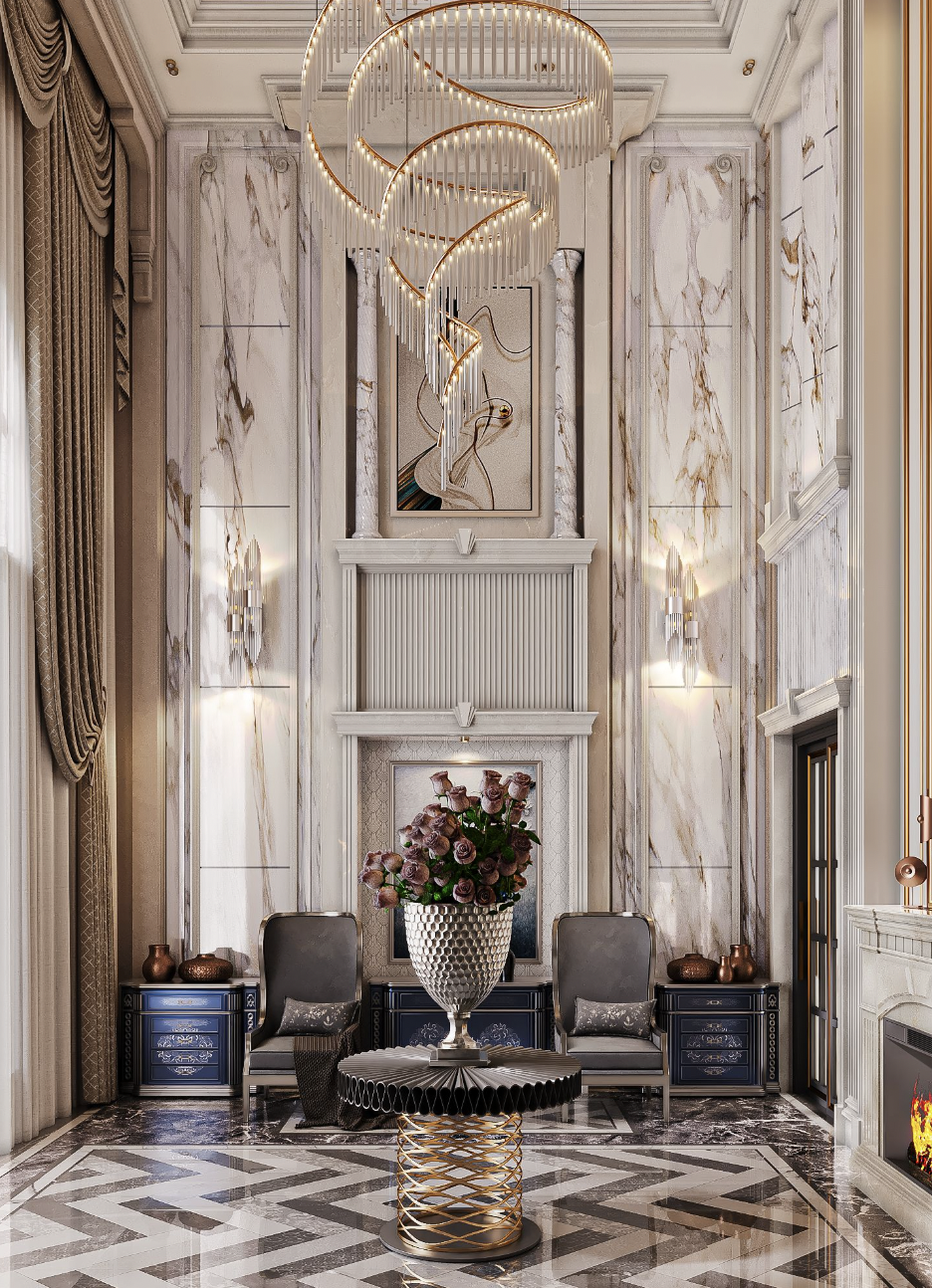 Lấy cảm hứng từ kiến trúc châu Âu, sảnh nhà theo phong cách cổ điển thường có cột trụ lớn, họa tiết chạm khắc tinh xảo và đèn trang trí sang trọng. Tông màu chủ đạo là vàng đồng, trắng hoặc xám đậm, kết hợp với vật liệu cao cấp như đá cẩm thạch, gỗ tự nhiên tạo nên vẻ đẹp uy quyền.