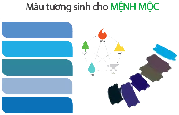 - Màu tương sinh (hành Thủy): Xanh nước biển, xanh lam, xanh da trời, đen. Những màu này tượng trưng cho trí tuệ, sự sâu lắng, mang lại năng lượng tích cực, sự tỉnh táo và cảm giác thư giãn. Màu đen còn biểu trưng cho quyền lực và sự bí ẩn.