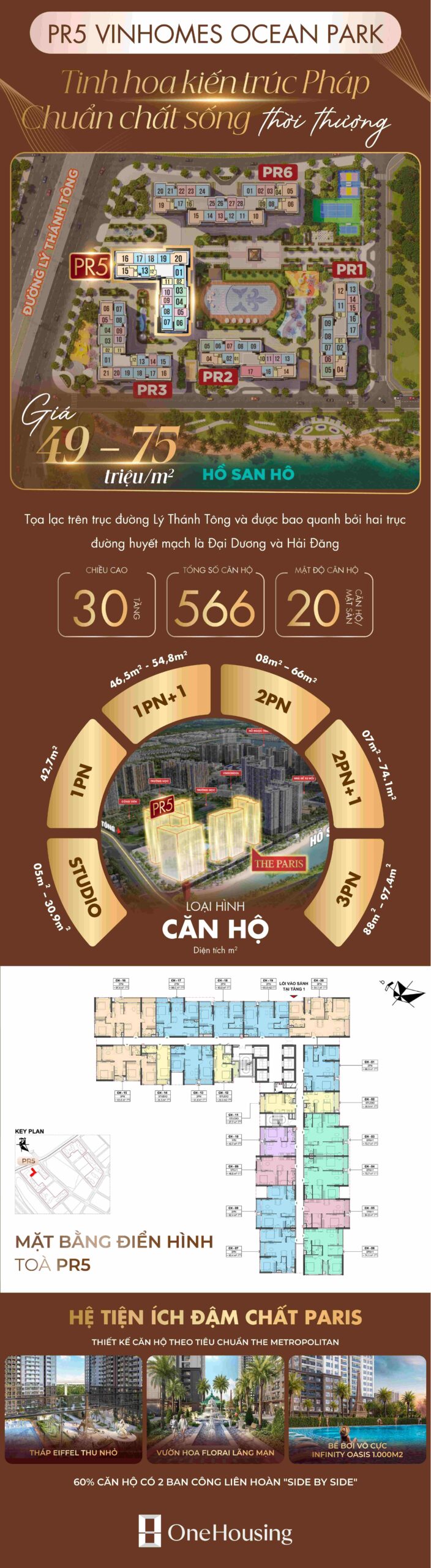 Tòa PR5 là tòa căn hộ thứ hai được giới thiệu tại phân khu The Paris, thuộc đại đô thị Vinhomes Ocean Park 1. Sở hữu vị trí đắc địa trên trục đường Lý Thánh Tông, ngay gần cổng chào San Hô Đỏ, PR5 mang đậm phong cách kiến trúc Paris hoa lệ với không gian sống sang trọng, thiết kế tối ưu và hệ thống tiện ích hiện đại. Dự án hứa hẹn mang đến một chuẩn mực sống đậm chất Pháp cho cư dân tinh hoa.