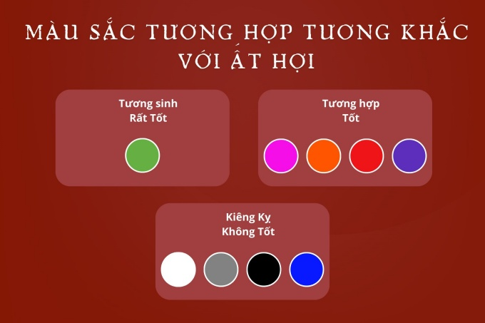 - Màu tương hợp: Xanh lá cây (thuộc hành Mộc, Mộc sinh Hỏa).