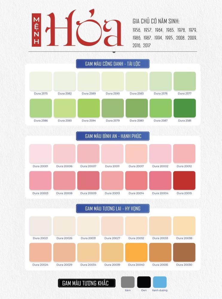 Bảng màu sơn nhà cho người mệnh Hỏa. Ảnh: dura