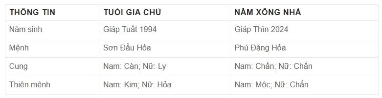 - Người xông đất 1980 (Canh Thân – mệnh Mộc): Ngũ hành Mộc tương sinh với Hỏa của gia chủ và năm Giáp Thìn, rất tốt. Thiên Can Canh tương khắc với Giáp (không tốt). Địa Chi Thân nằm trong bộ Tam Hợp với Thìn, rất tốt. Tổng điểm: 16/20 (Tốt).